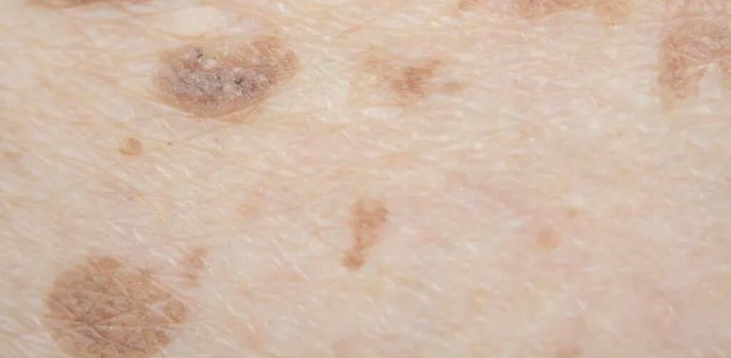 Age spots, also called solar lentigines or liver spots, are flat, tan, brown, or dark patches that appear on sun‑exposed skin, especially on the face, hands, forearms, shoulders, and chest. They have smooth surfaces with well‑defined edges and are typically painless. These spots become more noticeable with age, often after the age of 40, and are signs of long‑term sun exposure.