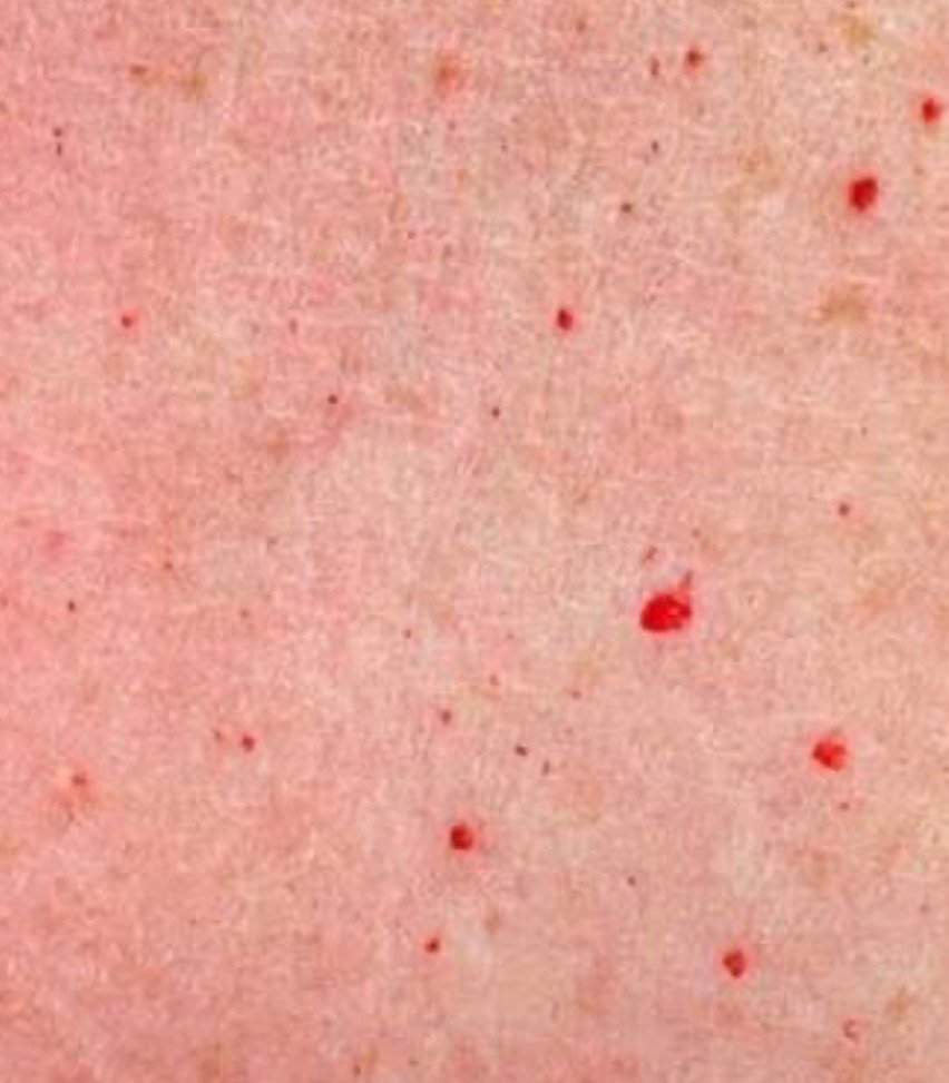 A very common, harmless skin growth made up of small clusters of capillaries (tiny blood vessels) located close to the surface of the skin. These spots appear as bright red, purple, or burgundy dome-shaped bumps, usually ranging from 1 to 5 millimeters in diameter. They are smooth, round, and may be flat at first before becoming slightly raised over time. Cherry angiomas are completely benign, meaning they are not cancerous and usually do not develop into any dangerous condition.