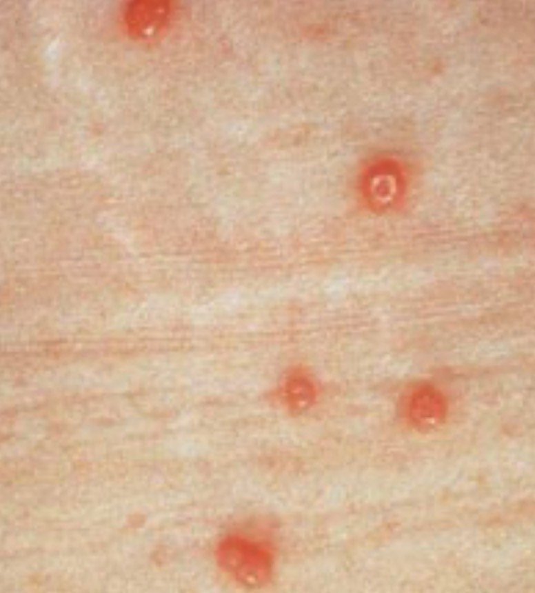Molluscum contagiosum is a common skin infection caused by a poxvirus that targets the epidermal cells, which are the outermost cells of the skin. The virus causes small, firm, dome-shaped bumps that often have a tiny dimple in the center. Inside these bumps, the virus forms viral inclusion bodies; collections of viral material seen under a microscope that help confirm the diagnosis. These lesions tend to be small between 2 to 5 mm.